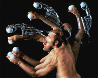 En “Stomach Sculpture”, Stelarc introdujo en su estómago una escultura de acrílico. Como corolario, su cuerpo devino en un espacio “viviente” de exhibición/ inhibición del objeto artístico, que sólo se volvía visible a través de una endoscopia. Más tarde, sus estudios en robótica se concretaron con la creación de “Third Hand”, un brazo electrónico dirigido a través de específicos estímulos musculares. Esta incursión biónica dio forma a una serie de performances en las que se exponía a la manipulación remota de movimientos involuntarios, cediendo a otros la potestad de sus gestos. Como en “Flactal Flesh”, mediante interfaces on-line, un público diseminado en distintas ciudades del mundo orquestaba un concierto de movimientos corporales que ya no eran suyos sino de otros sobre él. Su proyecto más reciente, “Extra Ear”, explora las posibilidades de una cibernética biotecnológica para la construcción de una oreja orgánica destinada a implantarse en su antebrazo izquierdo. Conectada a Internet, esta emulación auditiva funcionará como un órgano planetario de recepción y transmisión de sonidos.