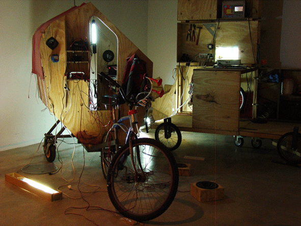 sensorium hegemónico de los espacios de habitar viene de la mano muchas veces en estos proyectos artísticos del recorrido y la movilidad. Se trata así de intervenciones móviles que apuestan a la construcción de sentidos no fijados en un único territorio sino que se constituyen en el desplazamiento. Sentidos hasta cierto punto efímeros que se van resignificando en cada nuevo espacio y acción, y que aspiran incluso a ganar espesor en el mismo movimiento. La bicicleta modificada parece ser su santo y seña, un objeto habitual, manejable a escala del cuerpo humano, que no requiere energía adicional más allá de la humana, pero que es intervenido convirtiéndolo en otra especie: casa rodante, taller y laboratorio ambulante.