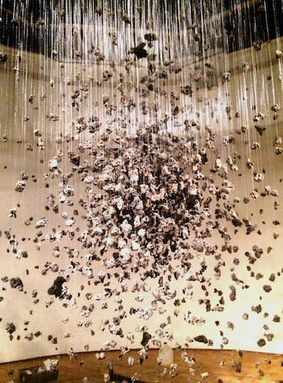 Volver a suspender (2017) es una instalación conformada por más de dos mil piedras volcánicas –sobre todo vidrio y cuarzo– que penden del techo de la sala de exhibición a diferentes alturas. Los materiales provienen de la zona del volcán Villarrica, cuya erupción de marzo de 2015 llenó el territorio de lava, posteriormente petrificada y devuelta a la tierra por efecto de la gravedad. Según Bahna, la obra constituye una vuelta de las cosas sobre sí, como si fuera posible reconstruir un instante efímero, en este caso el estallido, y se observara aquel momento fugaz en el que todos los fragmentos se encuentran dispersos en el espacio. Además, sensores de movimiento capturan la presencia del público y activan los sonidos de las piedras que se escucharían al caminar sobre ellas, o bien el ruido que generan al caer y golpear contra el suelo.