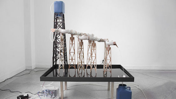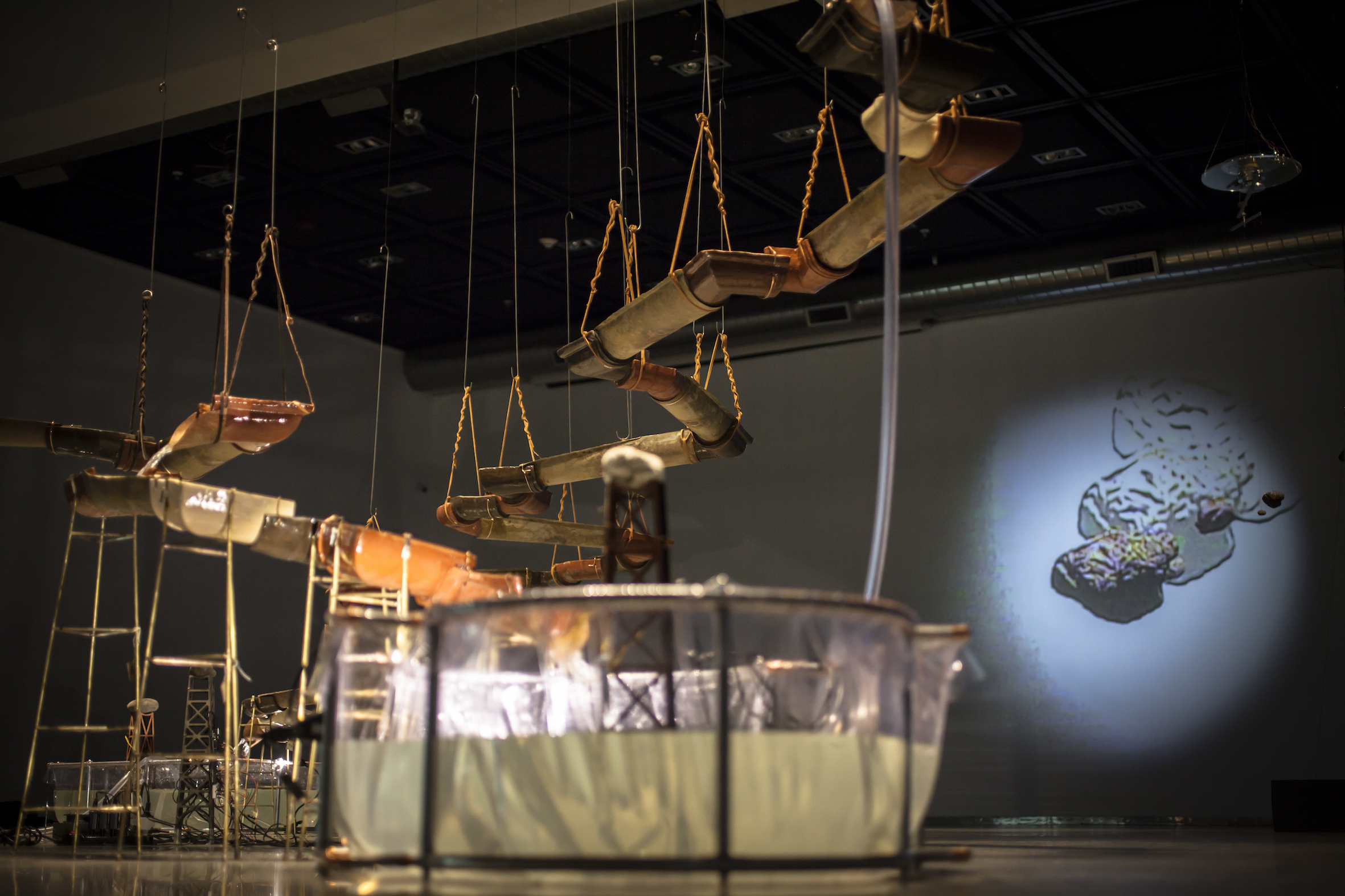 En Catastros de agua, proyecto realizado en 2015 en el marco de la Residencia realizada en Fundación Bilbao-Arte, en España, Claudia estudió en profundidad la Ría de Bilbao para desarrollar una instalación que recrea el sector de la ría conocido como La Peña. Un conjunto de tuberías de cerámicas sin vidriar unidas por piezas de bronce son sostenidas por torres de madera. El agua extraída por la artista de la propia ría fluye por la instalación gracias a la acción de un Arduino que controla una válvula solenoide y una bomba de agua que succiona el líquido de un bidón contenedor. Por efecto de la gravedad, el agua circula hacia abajo y en su trayecto poco a poco va manchando el interior de las tuberías de cerámica, de manera que el movimiento del fluido se convierte en medida de tiempo. La obra se completa con un video de la ría filmado bajo el agua con una cámara acuática y un gráfico mareal según los pleamares y bajamares, fenómenos asociados con las fases de la luna.
