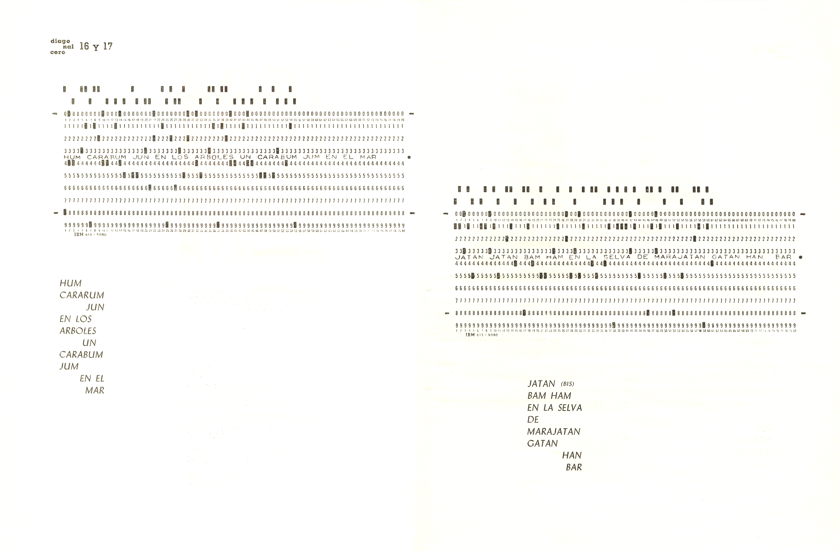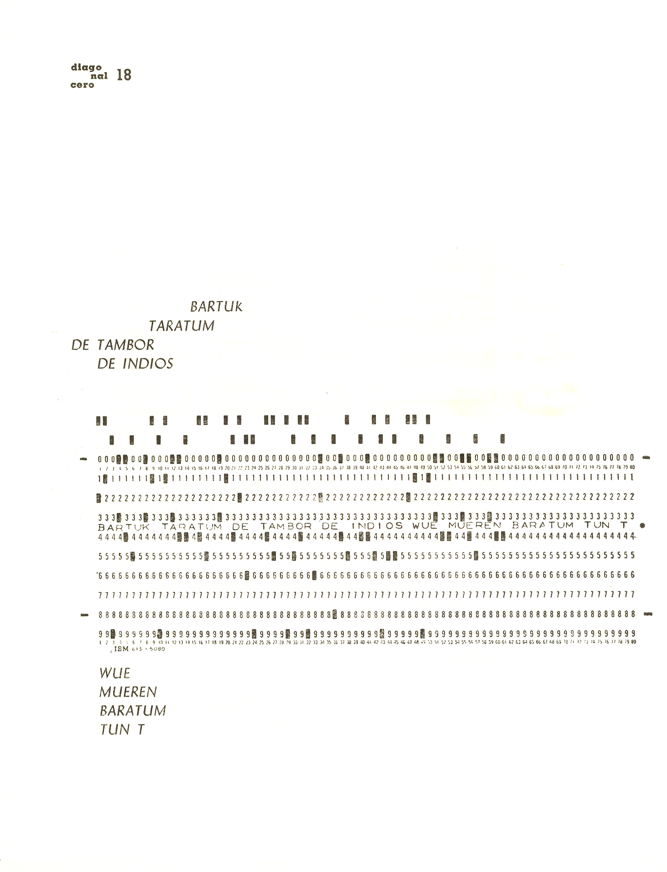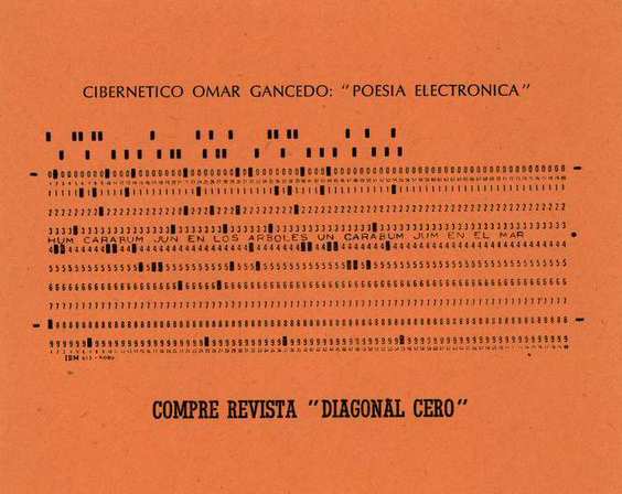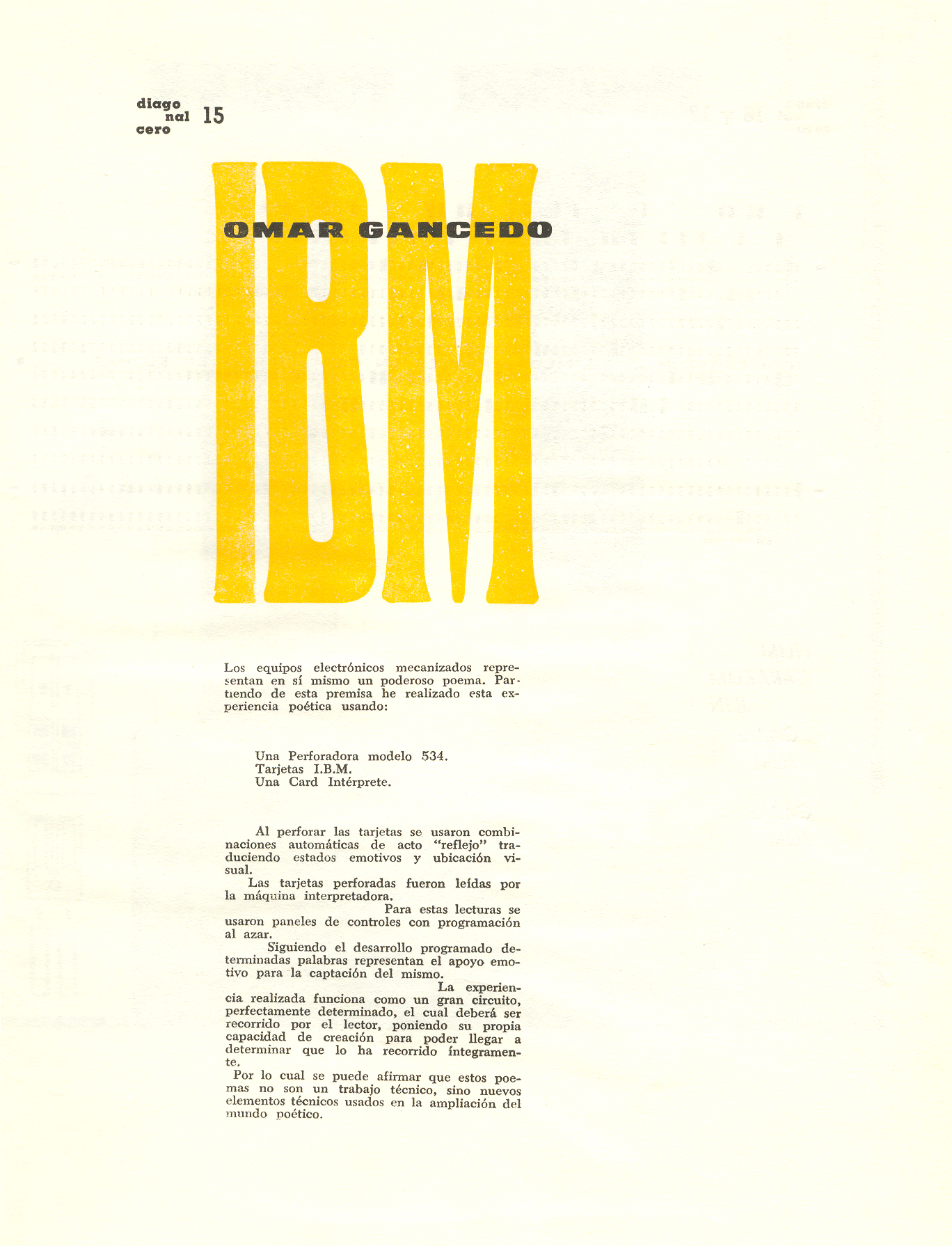 La serie IBM se inscribe en el campo de las poéticas tecnológicas experimentales que colisionan los mundos del cálculo, la programación y el azar. Utiliza lo que para la época era una “tecnología de punta” vinculada a la gestión de la información para instalar una política poética del desvío. El breve texto introductorio que antecede en Diagonal Cero a los poemas/tarjetas sostiene que para la perforación se usaron “combinaciones automáticas de acto ‘reflejo’ traduciendo estados emotivos y ubicación visual” y que para la decodificación se utilizaron “paneles de controles con programación al azar”. La perforación de las tarjetas asume casi el tono de una escritura automática en el trabajo de un poeta quien opera -hasta cierto punto- aleatoria e “irracionalmente” sobre una materia propia del mundo de la computación racional de información. Ese choque entre cálculo y azar puede leerse también en relación con otro choque: entre el mundo de la informática, que estaba comenzando a redefinir la vida cotidiana de las personas en el marco del capitalismo transnacional, y el mundo tribal en extinción al que refieren algo oblicuamente los textos de los tres poemas y que Gancedo comenzaba por aquellos años a investigar como antropólogo.
