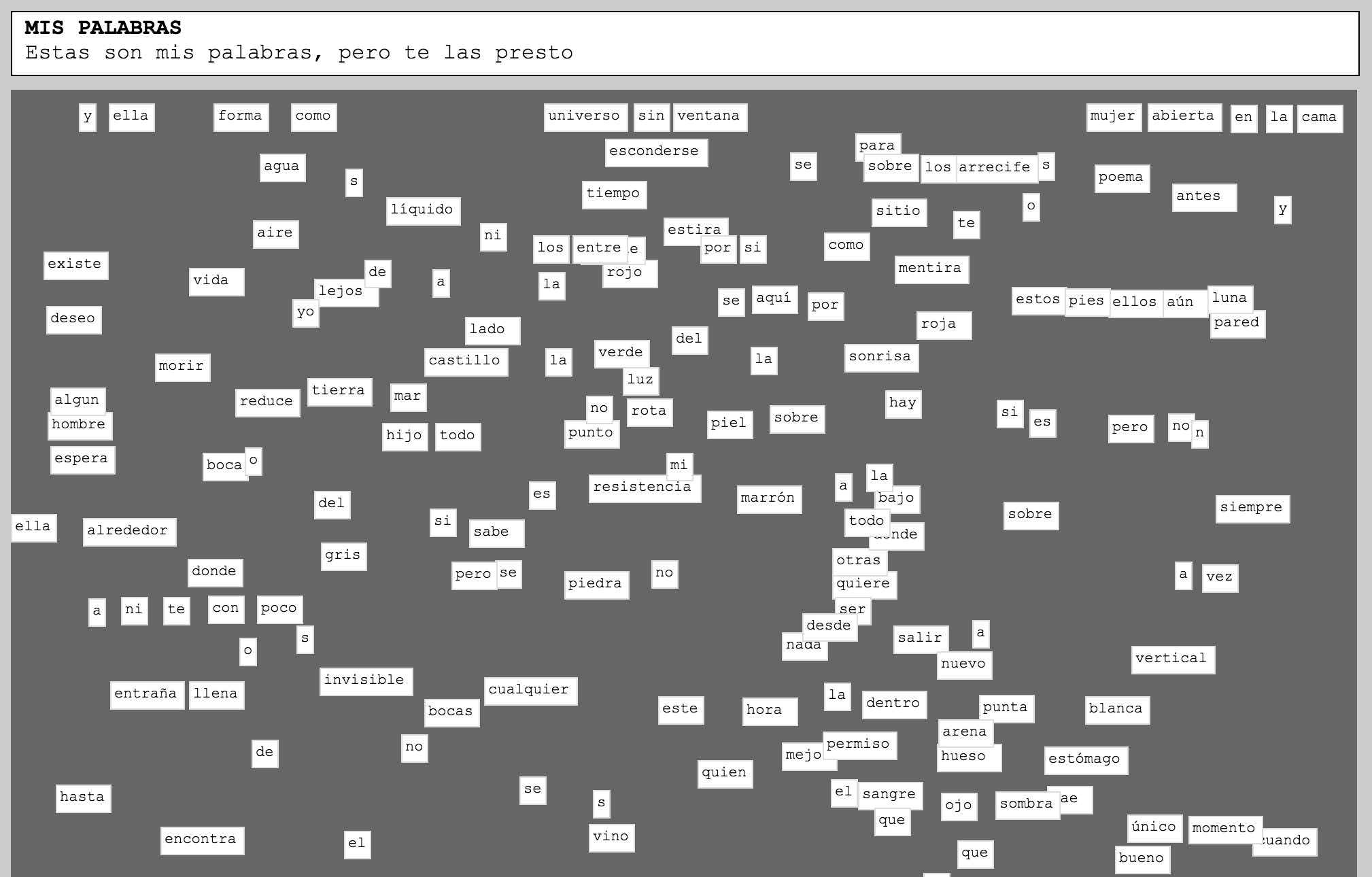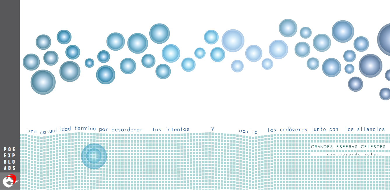 Parte de sus piezas encuadra en la poesía digital animada o cinética en muchos casos interactiva. Así por ejemplo, la ondulación de los dos versos que componen Grandes esferas celestes (2001) muestra un tipo de política de la materialidad textual de superficie, complementada a su vez por el carácter combinatorio que remite a un determinado algoritmo permutacional, esto es, a la materialidad del código. Al cliquear en alguna de las esferas de la parte superior de la pantalla, la misma cae y al tocar una de las palabras del poema no solo la permuta por otra palabra sino que hace que todo el conjunto ondule, movimiento que de algún modo duplica la mutación semántica del texto. La misma puesta en relieve de la materialidad textual de superficie, pero vinculada de modo más explícito a la materialidad del código, sucede en Mis palabras (2007), cuyo subtítulo o bajada dice: “Estas son mis palabras, pero te las presto”. Quienes interactúen con esta obra pueden disponer de una serie de palabras recuadradas en fondo blanco sobre una “pizarra” gris, de modo de agruparlas de diversas maneras para ir construyendo poemas. Debajo de la pizarra puede leerse una explicación que señala, por un lado, que se trata de las palabras con más frecuencia utilizadas en los poemas del propio Aburto –estadística lograda a partir de otro programa de relevamiento semántico que Aburto ha aplicado a su propia obra– y, por el otro, cuáles son las características del código utilizado: se recarga cada cuatro segundos, es multijugador –las palabras podrían moverse aparentemente solas en pantalla; esto sucede si hay más de una persona interactuando online al mismo tiempo– y guarda los cambios realizados por les “jugadores”. Un vínculo de agradecimiento que dice “gracias a broken notebook por el código” lleva por último a la página de donde se puede descargar el código de forma gratuita.
