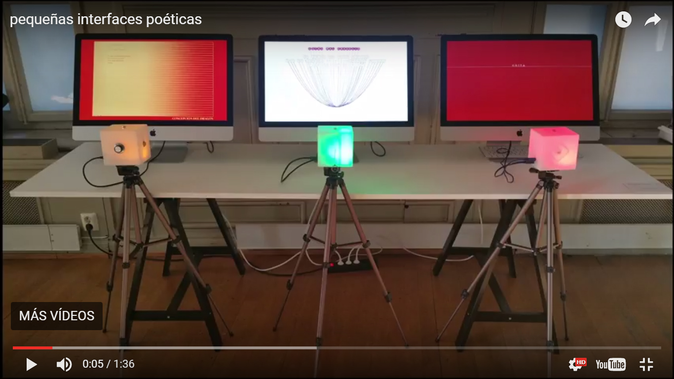 En su serie Pequeñas interfaces poéticas (2015), Aburto dio un paso más allá respecto de varios de sus poemas digitales previos al convertir a tres de ellos en materia de una instalación que hace dialogar la poesía digital, programada y aprehensible a través de la pantalla de la computadora, y la del fuera de pantalla en la que se involucran periféricos palpables más allá del hardware propietario y de los bits. Se da así un diálogo entre el poema digital que puede ser visualizado en pantalla con objetos de la vida cotidiana analógica como interesante operación que saca a la literatura digital de la mera novedad tecnológica. En esta instalación cada uno de los tres poemas depende para su efectuación de una intervención humana en relación con unas interfaces extrañas al entorno digital, construidas en tres pequeños cubos de acrílico –verde, amarillo o rojo– iluminados desde dentro. En uno de los poemas, Mal envuelto, encontramos en el cubo un hilo del que es preciso tirar para que el poema actúe en la pantalla; en Concepción del dragón, el cubo en cuestión tiene una pequeña perilla que hay que girar; y en Grita el cubo posee un micrófono hacia el que es preciso dirigir la voz, preferentemente en diversas modulaciones, para producir el efecto poema. Versiones anteriores de estos poemas eran sólo digitales, sin recurso a estos periféricos descentrados respecto de la cultura digital hegemónica, y son aún accesibles online en el sitio web del artista. Es ese caso, en los dos primeros se interactúa a través del uso del mouse y en el tercero vía la cámara y micrófono de cada computadora. Algo a destacar es que la luz interior que ilumina cada cubo permite ver sólo la sombra del mecanismo interior que, puesto en marcha por quien interactúa, da lugar en la pantalla a cada poema programado en Flash. Aburto habla en este sentido de “la sombra de la electrónica”, un modo de poner en evidencia la caja negra digital, aunque sólo como una sospecha ya que no es posible ver en detalle el mecanismo que incluye piezas mecánicas y microsensores digitales. Así los poemas muestran y ocultan a la vez el revés de la trama de la cultura digital. En forma adicional, desacostumbran nuestras interacciones habituales y estandarizadas: un hilo o una perilla no son equivalentes a un teclado o a un mouse.