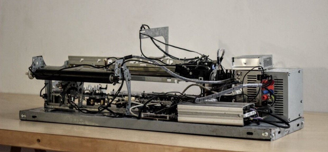 La exploración sobre los objetos como soportes de memoria es también una cualidad de Kinemancia (2021), parte de la serie Memorias magnéticas. En este caso, la performance consiste en la puesta en acto de una máquina fabricada por Crowe a partir de casettes y reproductores, partes de impresoras, teléfonos, máquinas de escribir, lavarropas, juguetes pequeños, entre otras piezas. Tanto los sonidos de la máquina como los de las cintas magnéticas de los casettes son procesados a través de una computadora y un controlador MIDI. Se proyectan en simultáneo imágenes intervenidas procedentes de las cámaras incorporadas en el objeto técnico, que van mutando conforme cambian las acciones que realiza. En palabras del artista, se trata de un dispositivo que emerge de la indagación sobre la tecnología cinematográfica, en una búsqueda por otras formas estéticas y técnicas de hacer cine. Los casettes se convierten en una materia central para la obra, en una búsqueda por activar la dimensión emocional que comportan estos objetos, no sólo como soportes de almacenamiento, sino como materia de la memoria individual y colectiva. Este “artefacto mediático intertemporal” se vincula también con la reflexión sobre la obsolescencia a través del interrogante acerca de lo perdido u olvidado por acción de la innovación constante, que a su paso convierte en desechos a los materiales anteriores, y con ellos a las expresiones culturales y memorias que ahí anudan.