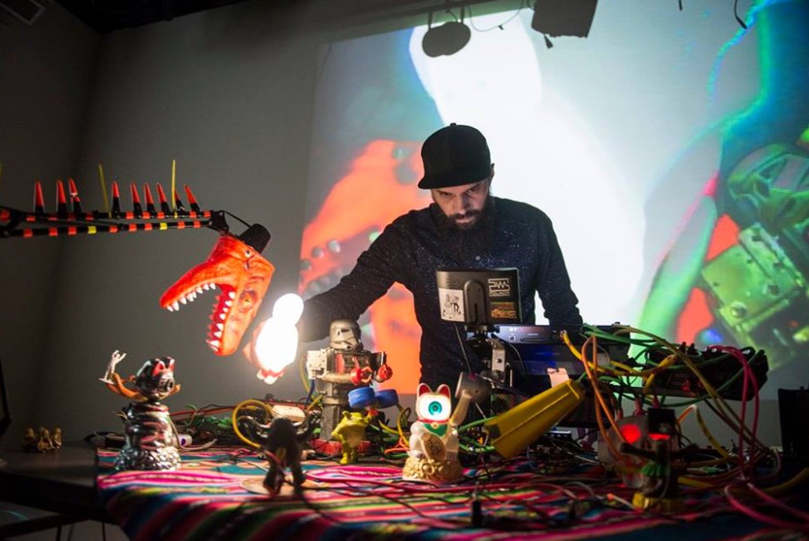 Jorge Crowe (1976) es artista audiovisual, docente y desarrollador. Es oriundo de Tunuyán, Mendoza, actualmente reside en Villa Elisa, La Plata, y desarrolla su trabajo en Buenos Aires y alrededores. En su obra recurre a la reutilización y restauración de materiales electrónicos analógicos y digitales para la creación de instalaciones y objetos sonoros que incorpora en experiencias audiovisuales en vivo. Su experimentación sobre materiales obsoletos -desechados, recuperados de mercados de pulgas o de la calle- involucra la práctica de circuit bending: conectar diversos componentes desviando sus funciones respecto del diseño original. Tal es el caso de Ludotecnia (2015), una performance audiovisual en la que convergen los sonidos de juguetes modificados y sus movimientos proyectados en gran formato. Las acciones son registradas por pequeñas cámaras desde el “escenario” -una mesa con los artefactos y luces- e intervenidas durante la experiencia, dando lugar a imágenes oníricas de los juguetes que cobran vida como una orquesta fluorada. El universo de ciencia ficción que la obra presenta se arraiga en la recuperación de los juguetes, como artefacto significativo de la niñez, materia de la imaginación y también de la memoria. Emerge entonces la posibilidad, la fantasía, de reconocer lo que aquellos objetos técnicos pueden escenificar de otros tiempos y experiencias más allá de un recuerdo preciso. La experimentación se convierte en espacio intergeneracional valiéndose de la carga afectiva de los juguetes; contribuye a abrir el interrogante acerca de cuándo y por qué un juguete puede obsolescer. Al movilizar su doble condición de objeto del juego y materia parlante rescatada, la experimentación en la obra es técnica y poética, pero también es parte de la condición misma del juego: si jugar es experimentar con juguetes, intervenirlos es una forma de volver a jugar con ellos. En línea con estos intereses, Crowe coordina desde 2008 el Laboratorio de Juguete, un espacio para la experimentación con electrónica; e integra Flexible, un proyecto de Arte, Ciencia y Tecnología para la infancia.